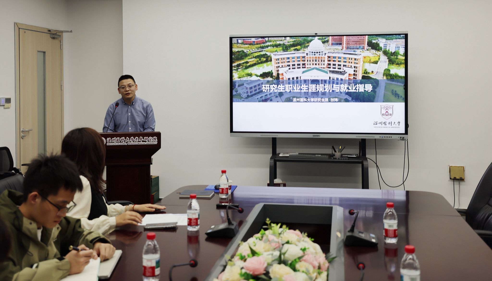 为帮助研究生明晰职业发展方向、提升就业竞争力,2026年4月16日下午,“科研杂谈”系列讲座第18期在生物医药科研楼北17楼会议室如期开讲。本期讲座以“研究生职业生涯规划与就业指导”为主题,特邀温州医科大学党委研究生工作部研究生工作办公室主任张玮老师担任主讲人。讲座由刘明琰老师主持,我院研究生到场聆听,现场气氛热烈。