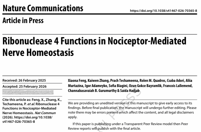 冯晓娜Nature Communications发文:Ribonuclease 4 Functions in Nociceptor-Mediated Nerve Homeostasis