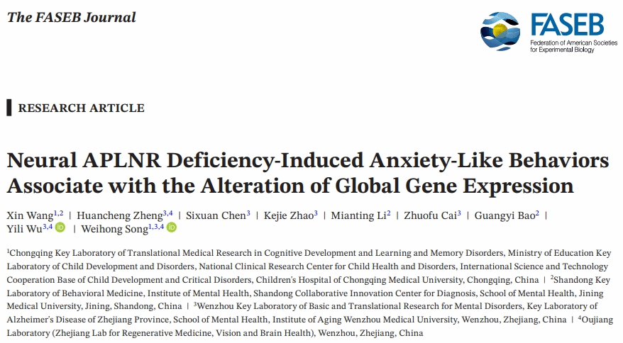 宋伟宏、吴伊丽FASEB JOURNAL发文:Neural APLNR Deficiency-Induced Anxiety-Like Behaviors Associate with the Alteration of Global Gene Expression